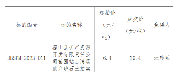 受霍山縣礦產資源開發(fā)有限責任公司委托,我公司于2023年12月29日上午9時30分在安徽大別山工程咨詢有限公司開標廳舉辦霍山縣礦產資源開發(fā)有限責任公司苗圃站點清場廢棄砂石土拍賣會。現(xiàn)將結果公告如下: